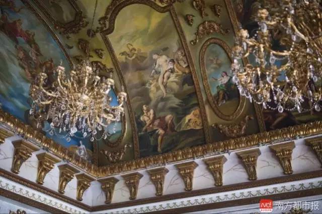 酒店大堂的穹頂以文藝復興風格的油畫覆蓋,黃河山強調那是手工畫的,而吊頂水晶燈則出自他經營的工廠。